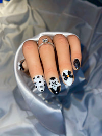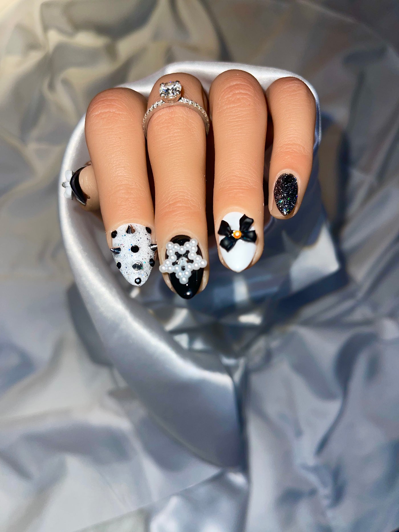 Turn heads with this bold and elegant black-and-white press-on nail set, designed for ultimate sophistication and statement style. Each nail is handcrafted with exquisite 3D detailing—featuring shimmering glitter, chic polka dots, luxe pearl embellishments, and striking black bows with gemstone accents.