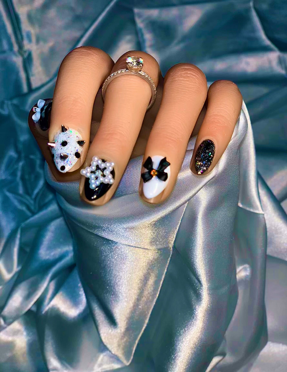 Black & White Bow Luxe Press-On Nails – Pearl & Stud Accent Set
